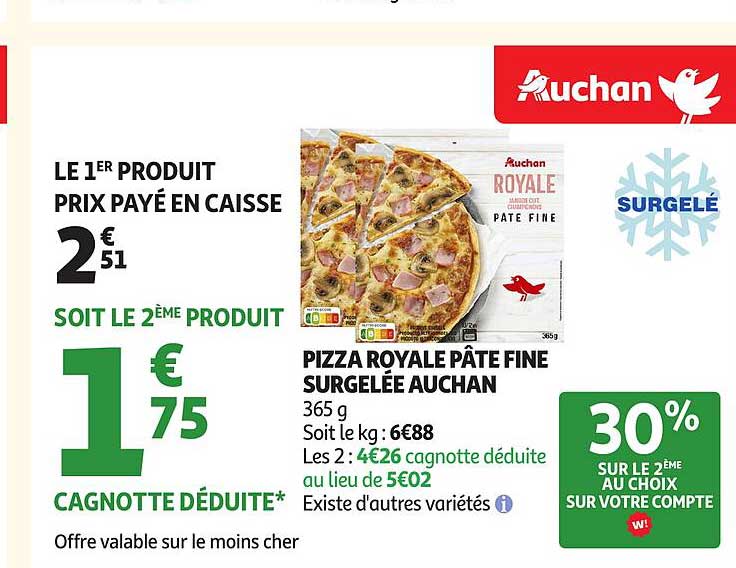 Découvrez dès maintenant la offre Pizza Royale Pâte Fine Surgelée Auchan dans le catalogue de Auchan Supermarché. Cette offre est valable du 14/10/2025 au 25/10/2025.