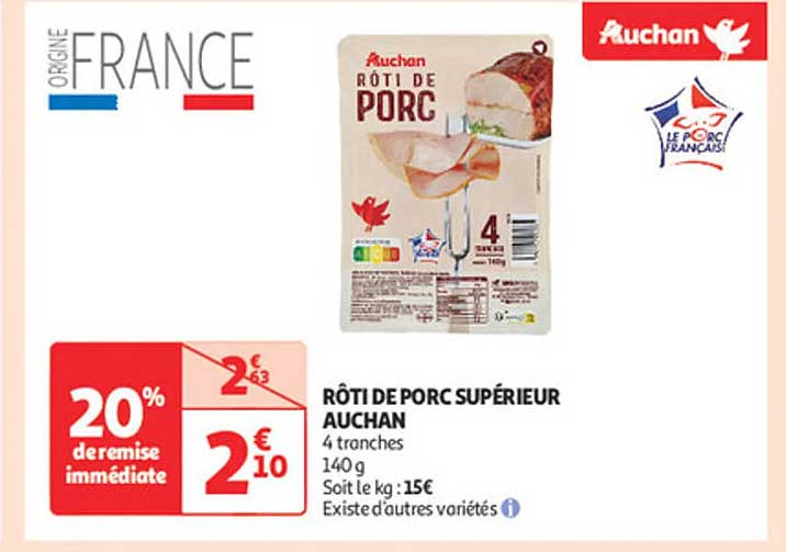 Découvrez dès maintenant la offre RÔTI DE PORC SUPÉRIEUR AUCHAN dans le catalogue de Auchan Supermarché. Cette offre est valable du 20/05/2025 au 31/05/2025.