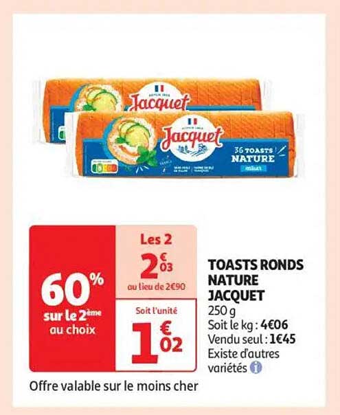 Découvrez l'offre exceptionnelle sur les Toasts Ronds Nature Jacquet, parfaits pour vos apéritifs ou vos repas rapides. Ces toasts, savoureux et légers, constituent une base idéale pour vos garnitures préférées, que ce soit des tartinades, des pâtés ou des légumes.