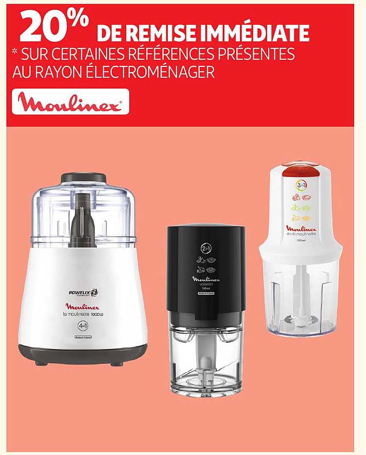 Bonjour à tous ! Si vous êtes à la recherche d’un bon plan dans le domaine de l’électroménager, vous êtes au bon endroit. Grâce à Auchan, profitez d'une remise immédiate de 20% sur certaines références de la marque Moulinex. Que vous soyez un amateur de cuisine ou un cuisinier chevronné, ces petits appareils vous faciliteront la vie en cuisine. Ne ratez pas cette occasion d'agrémenter votre espace culinaire à prix cassés !
