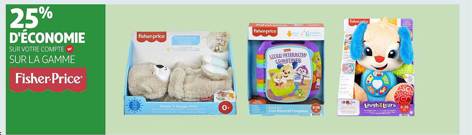Profitez de cette incroyable promotion sur les produits Fisher-Price, un incontournable pour accompagner le développement de vos enfants. Du 2025-11-18 au 2025-11-30, vous pouvez réaliser 25% d'économie sur une sélection de jouets éducatifs et interactifs qui favorisent l'apprentissage tout en s'amusant. N'attendez pas qu'il soit trop tard, cette offre n'est valable que pour une période limitée !