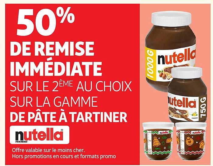 Amateurs de douceurs, préparez-vous à vous faire plaisir avec cette offre exceptionnelle sur la célèbre gamme de pâte à tartiner Nutella. Du 12 au 23 novembre 2025, vous bénéficiez de 50% de remise immédiate sur le deuxième pot de pâte à tartiner au choix. Une occasion rêvée pour régaler vos papilles tout en réalisant des économies. Qui peut résister au goût inimitable de Nutella ?