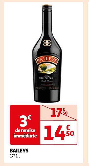Découvrez la superbe offre de Baileys dans le nouveau catalogue de Auchan. En plus de cette offre, vous trouverez de nombreuses autres réductions attrayantes. Vous pouvez facilement commander le Baileys en ligne via le site web de Auchan ou l'acheter dans un magasin près de chez vous.