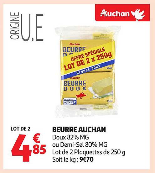 Vous cherchez à ajouter une touche savoureuse à vos plats ? Découvrez cette offre incroyable sur le Beurre Auchan, disponible en lot de 2 plaquettes de 250 g. Avec un taux de matière grasse de 82 % pour le beurre doux et 80 % pour le beurre demi-sel, c'est l'élément indispensable de votre cuisine. Cette promotion vous permettra de profiter de ce produit de qualité à un prix réduit. Ne manquez pas cette occasion de sublimer vos recettes !