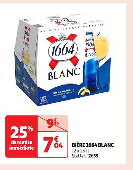 Découvrez l'offre exclusive sur la Bière 1664 Blanc, une bière blanche savoureuse qui ravira vos papilles. Pour une durée limitée, profitez d'une remise de 25 %, ce qui en fait une véritable aubaine pour les amateurs de bières de qualité. Parfaite pour accompagner vos repas ou pour vos moments de détente entre amis, cette bière est un incontournable.