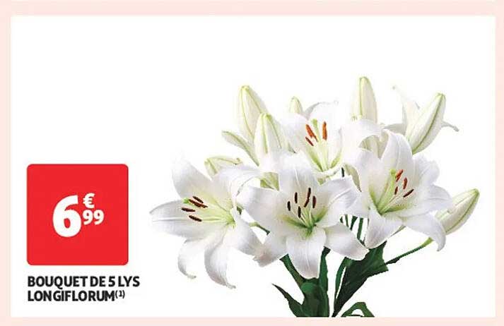 Découvrez dès maintenant la offre BOUQUET DE 5 LYS LONGIFLORUM dans le catalogue de Auchan. Cette offre est valable du 01/04/2025 au 05/04/2025.