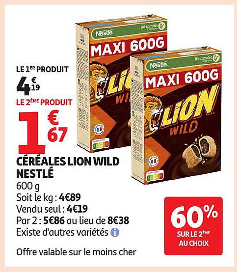 Les Céréales Lion Wild de Nestlé sont un savoureux mélange de croustillant et de chocolat, parfaites pour commencer la journée en beauté. Cette promotion vous permet de profiter d'une seconde boîte à un prix réduit, une excellente opportunité à ne pas manquer !
