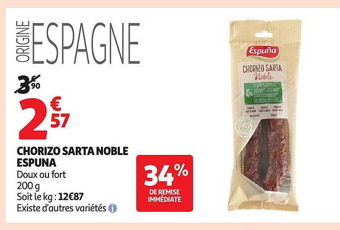 Découvrez dès maintenant la offre CHORIZO SARTA NOBLE ESPUNA dans le catalogue de Auchan. Cette offre est valable du 07/10/2025 au 19/10/2025.