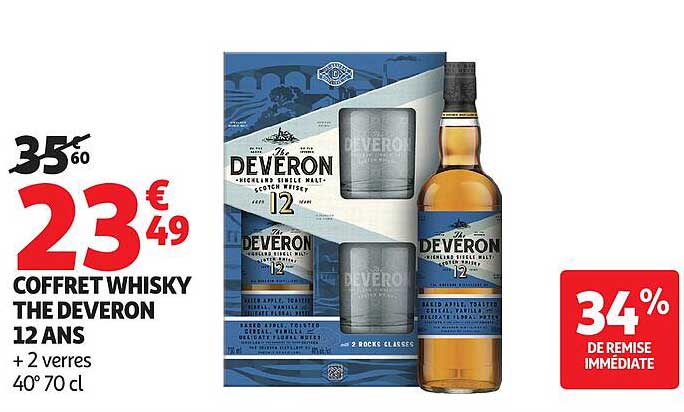 Découvrez le coffret whisky The Deveron 12 ans, une offre exceptionnelle disponible ici pour une durée limitée. Ce coffret, comprenant une bouteille de 70 cl ainsi que deux verres, est idéal pour les amateurs de whisky. Avec une remise de 34%, c'est le moment parfait pour vous faire plaisir ou offrir un cadeau unique à un proche.