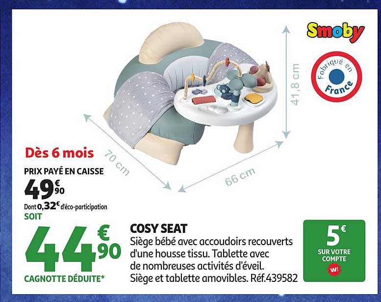 Découvrez le Cosy Seat, un siège bébé ludique et confortable, idéal pour les enfants dès 6 mois ! Avec son design attrayant, il est parfait pour offrir à votre petit des moments de jeu en toute sécurité. Profitez de cette offre exceptionnelle d'Auchan pour offrir le meilleur à votre enfant.