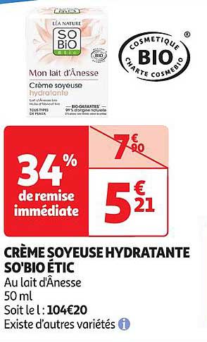 Offre de Crème Soyeuse Hydratante So'bio Étic chez Auchan