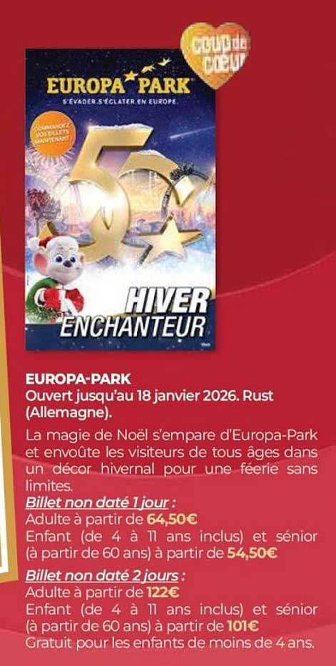 Découvrez dès maintenant la offre EUROPA PARK - HIVER ENCHANTEUR dans le catalogue de Auchan. Cette offre est valable du 05/11/2025 au 24/12/2025.