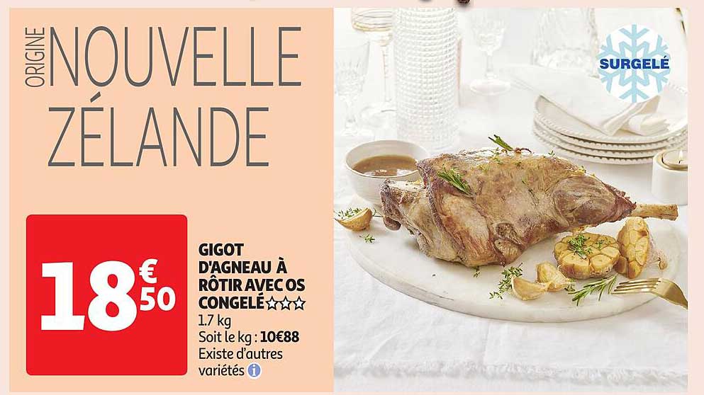 Profitez d'une succulent gigot d'agneau à rôtir, provenant directement de Nouvelle-Zélande, dans cette offre exceptionnelle valable du 15 au 21 avril 2025. Ce produit surgelé fait partie intégrante de la gastronomie, offrant à la fois tendreté et saveur, parfait pour vos repas familiaux ou vos dîners entre amis.