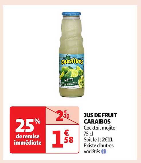 Découvrez le délicieux jus de fruit Caraïbos, un cocktail mojito rafraîchissant de 75 cl, proposé avec une remise exceptionnelle de 25 %. Parfait pour les journées ensoleillées ou pour ajouter une touche festive à vos soirées entre amis, ce jus de fruit est une véritable invitation à la détente.