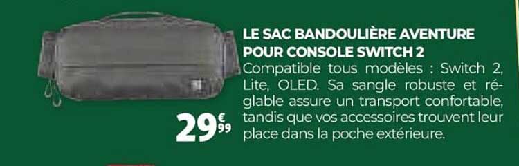 Vous recherchez une solution pratique et élégante pour transporter votre console Switch ? Ne cherchez plus ! Le Sac Bandoulière Aventure pour Console Switch 2 est l’accessoire idéal pour tous les gamers en déplacement. Avec son design accueillant, vous pourrez prendre votre console Switch 2, Lite ou OLED partout avec vous. Profitez de cette offre exceptionnelle sur cette page !