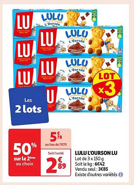 Ne manquez pas cette incroyable promotion sur les LULU L'OURSON LU ! Avec leur délicieuse saveur chocolatée, ces biscuits sont parfaits pour une collation gourmande ou pour accompagner votre tasse de café. Profitez d'une réduction de 50% sur le deuxième lot, une occasion à ne pas rater !