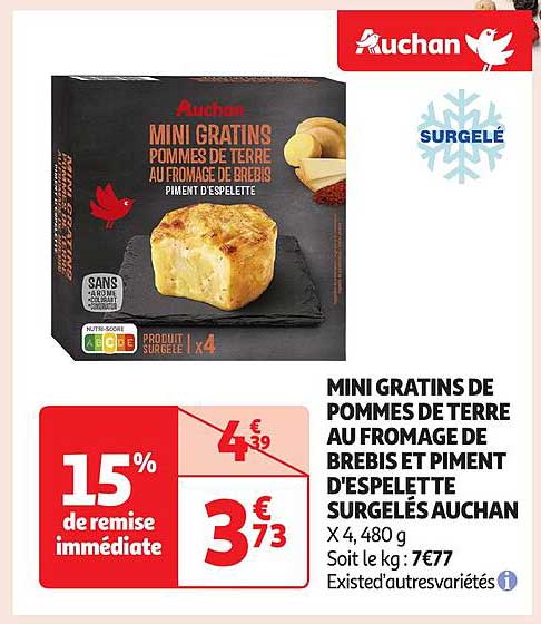 Découvrez dès maintenant la offre MINI GRATINS DE POMMES DE TERRE AU FROMAGE DE BREBIS ET PIMENT D'ESPELETTE dans le catalogue de Auchan. Cette offre est valable du 15/04/2025 au 21/04/2025.