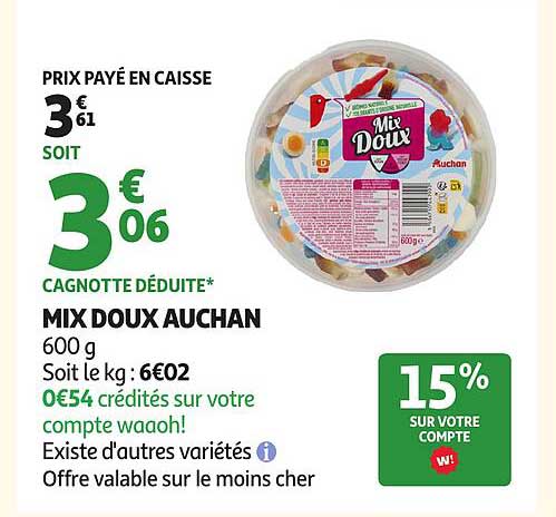 Découvrez les délicieuses douceurs du Mix Doux Auchan, idéal pour partager des moments conviviaux en famille ou entre amis. Ce mélange de bonbons colorés et savoureux saura séduire petits et grands. Profitez d'une offre exceptionnelle sur cette gourmandise, valable seulement du 14 au 26 octobre 2025.