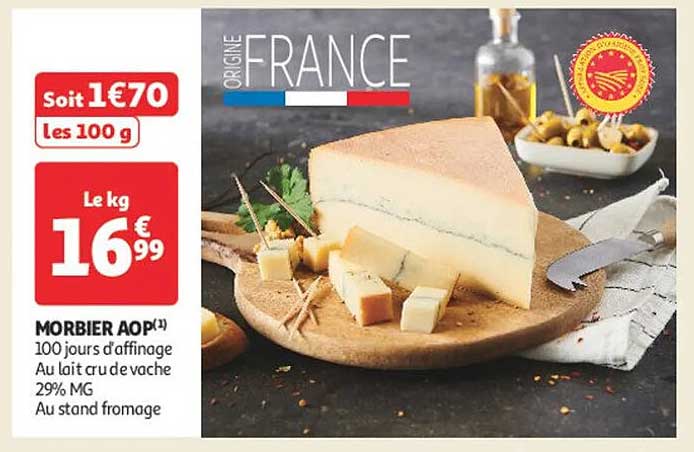 Actuellement, le Morbier AOP est proposé à seulement 16,99 € le kg, soit 1,70 € les 100 g. C'est une occasion à ne pas manquer si vous voulez profiter d'un fromage de qualité à un prix abordable, comparé à d'autres fromages de la même catégorie sur le marché.