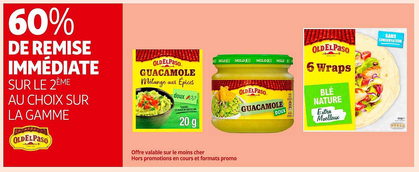 Offre de Old El Paso Guacamole Mélange Aux Épices Old El Paso Guacamole Doux Old El Paso 6 Wraps Blé Nature Extra Moelleux chez Auchan