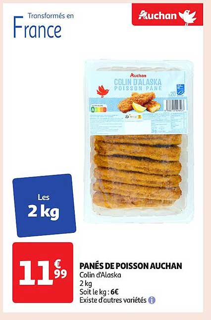 Découvrez une offre irrésistible sur les panés de poisson d'Auchan, parfaits pour les repas en famille ou les soirées entre amis. Avec un poids de 2 kg, cette emballage généreux saura satisfaire toutes les bouches tout en apportant une touche de fraîcheur à votre table.