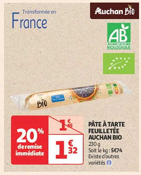 Découvrez la pâte à tarte feuilletée Auchan Bio, un produit idéal pour réaliser vos tartes et quiches faits maison. Profitez d'une offre exceptionnelle avec 20% de remise immédiate, rendant ce produit à la fois délicat et économique. Grâce à sa certification AB, vous pouvez cuisiner en toute sérénité.