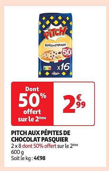 Vous rêvez de douceurs chocolatées qui ravissent les papilles de toute la famille ? Ne cherchez pas plus loin ! Sur cette page, Auchan vous présente une offre irrésistible sur les PITCH aux pépites de chocolat Pasquier. Parfaites pour les goûters ou les petites faims, ces gourmandises sont de véritables coups de cœur. Profitez de ce moment de plaisir à un prix réduit durant la période de promotion !