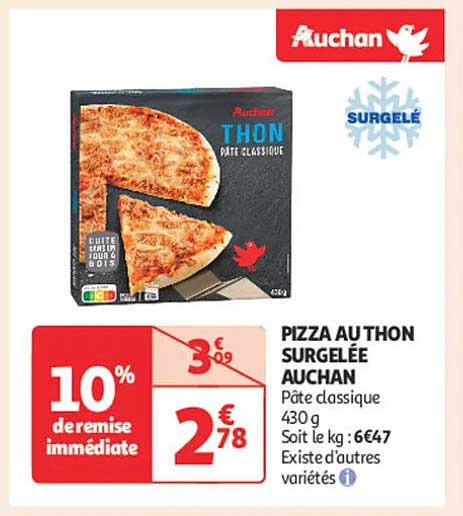 Découvrez la délicieuse pizza au thon surgelée Auchan, idéale pour un repas rapide et savoureux ! Avec une pâte classique et un goût riche, cette pizza saura ravir les papilles de toute la famille. Profitez d'une remise immédiate de 10 % sur cette offre qui est valable jusqu'au 21 avril 2025.