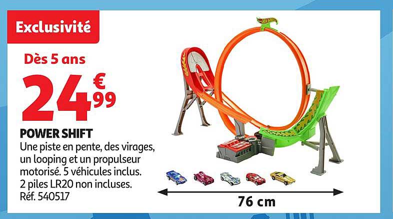 Découvrez la piste POWER SHIFT, conçue pour les enfants dès 5 ans! Avec ses virages serrés, son looping impressionnant et son puissant propulseur motorisé, cette piste promet des heures de jeu inoubliables. À seulement 24,99 €, c'est une occasion à ne pas rater pour les petits amateurs de vitesse et d'aventure.