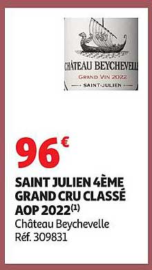 Découvrez une occasion unique d'ajouter à votre cave un vin d'exception : le Château Beychevelle, un grand cru classé de l'appellation Saint Julien. Ce vin prestigieux, récolté en 2022, saura séduire les amateurs les plus avertis et apportera une touche d'élégance à toutes vos tables. Son prix de 96 € en fait une offre à ne pas manquer, valable jusqu'au 12 octobre 2025.