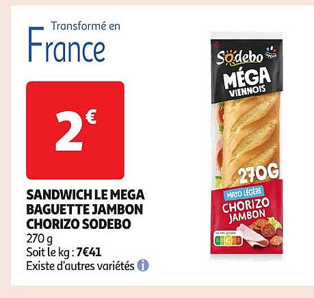 Offre de Sandwich Le Mega Baguette Jambon Chorizo Sodebo chez Auchan