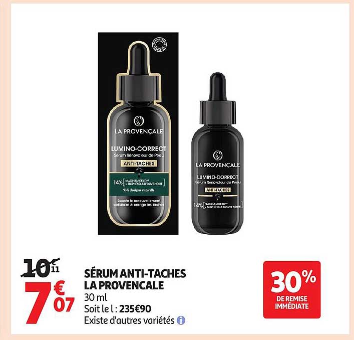 Découvrez dès maintenant la offre SÉRUM ANTI-TACHES LA PROVENCALE dans le catalogue de Auchan. Cette offre est valable du 07/10/2025 au 19/10/2025.