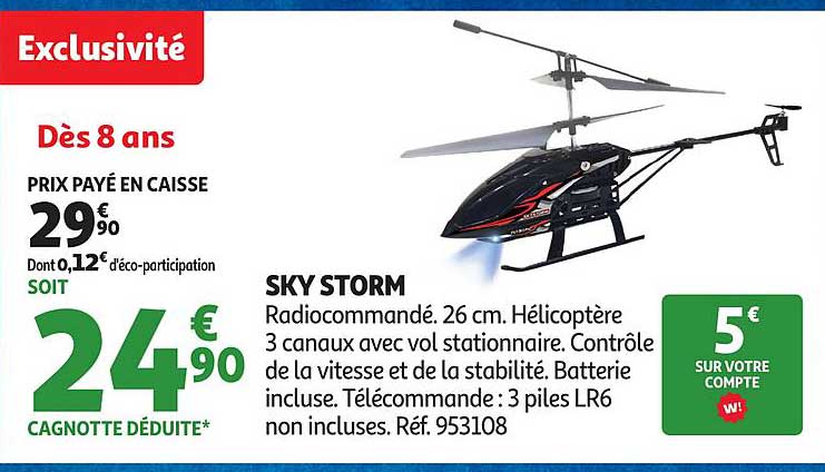 Découvrez l'hélicoptère radiocommandé SKY STORM, un jouet idéal pour les petits aventuriers à partir de 8 ans. Avec sa taille de 26 cm et son design élégant, cet hélicoptère offre une expérience de vol inoubliable à tous les passionnés d'aviation. Profitez de cette offre promotionnelle et préparez-vous à décoller !