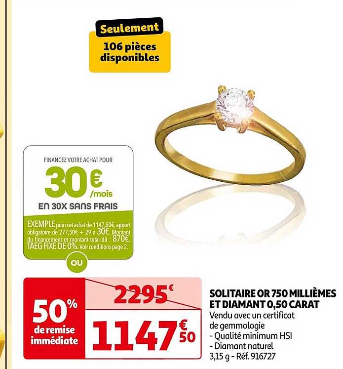 Offre de Solitaire Or 750 Millièmes Et Diamant 0,50 Carat chez Auchan