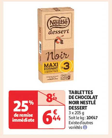 Découvrez la promotion irrésistible sur les tablettes de chocolat noir Nestlé Dessert, parfaites pour les amateurs de chocolat. Cette offre, valable jusqu'au 21 avril 2025, vous permettra de réaliser de délicieuses recettes tout en faisant des économies. N'attendez plus pour vous faire plaisir et enrichir vos créations culinaires avec ce chocolat de qualité !