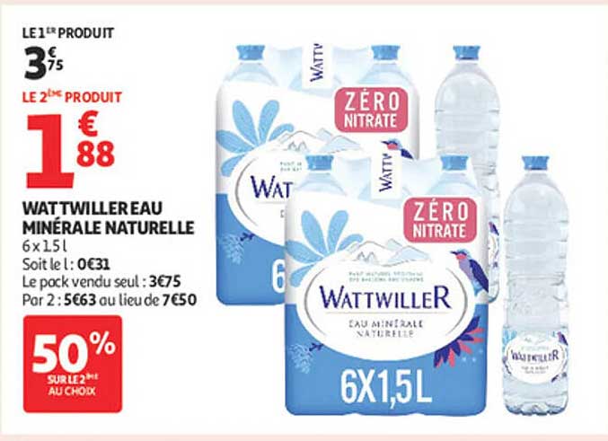 Découvrez dès maintenant la offre WATTWILLER EAU MINÉRALE NATURELLE 6 x 1,5L dans le catalogue de Auchan. Cette offre est valable du 22/07/2025 au 26/07/2025.
