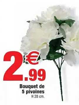 Découvrez dès maintenant la offre Bouquet de 5 pivoines H 28 cm dans le catalogue de Bazarland. Cette offre est valable du 15/11/2025 au 02/11/2026.