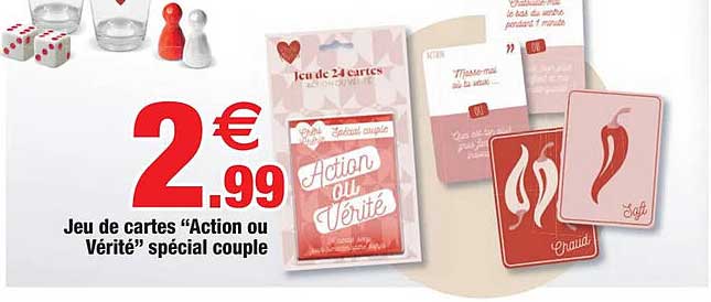 Découvrez la superbe offre de Jeu De Cartes “Action Ou Vérité” Spécial Couple dans le nouveau catalogue de Bazarland. En plus de cette offre, vous trouverez de nombreuses autres réductions attrayantes. Vous pouvez facilement commander le Jeu De Cartes “Action Ou Vérité” Spécial Couple en ligne via le site web de Bazarland ou l'acheter dans un magasin près de chez vous.