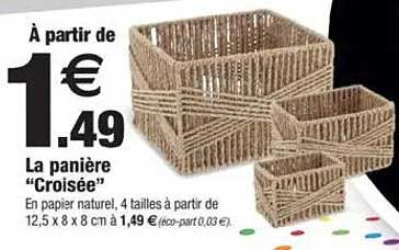 Découvrez la panière “Croisée”, un accessoire de rangement à la fois esthétique et pratique. Disponibles en quatre tailles, ces panières en papier naturel sont pensées pour embellir votre intérieur tout en offrant une solution de rangement efficace. Profitez de cette offre exceptionnelle valable du 15 au 25 octobre 2025, et faites le plein d'organisation à petit prix.