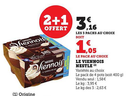 Découvrez l'incroyable promotion sur les célèbres Viennois Nestlé, disponibles à un prix exceptionnel. Pour toute commande de trois packs, vous en obtenez un gratuitement ! C'est l'occasion rêvée de savourer ces délicieuses gourmandises crémeuses et chocolatées qui raviront petits et grands.