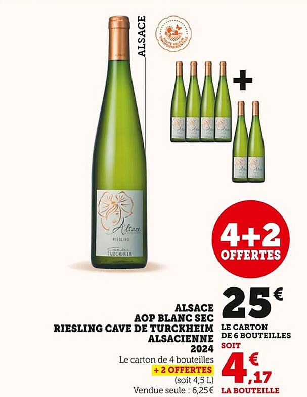 Découvrez une offre sensationnelle sur le Riesling d'Alsace de la cave de Turckheim ! Profitez d'un carton de 6 bouteilles pour le prix incroyable de 25 €, incluant non seulement les 4 bouteilles, mais aussi 2 offertes. C'est l'occasion parfaite de découvrir ce vin blanc sec tout en faisant des économies !