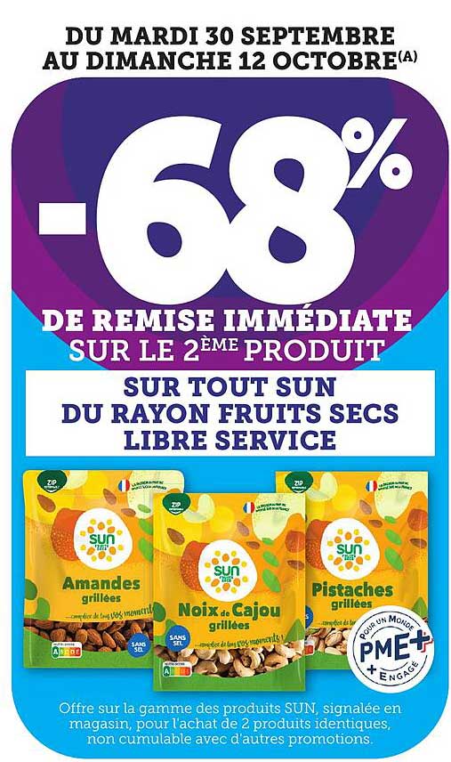 Découvrez une offre exceptionnelle sur les produits de la marque SUN, valable du 30 septembre au 12 octobre. Profitez d'une remise immédiate de 68% sur le deuxième produit lorsque vous achetez deux articles de la gamme de fruits secs en libre-service. Une opportunité à ne pas manquer pour les amateurs de noix et fruits sains !