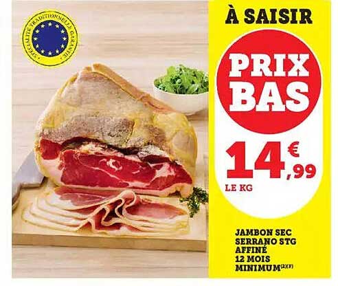 Découvrez une opportunité exceptionnelle sur un produit de charcuterie d'exception ! Le jambon sec Serrano STG affiné 12 mois minimum est disponible à un prix imbattable. C'est le moment parfait pour se faire plaisir avec des saveurs authentiques tout en réalisant des économies. Que ce soit pour un apéritif entre amis ou un repas savoureux en famille, ce jambon saura séduire votre palais.