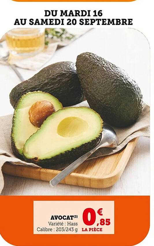 Craquez pour l'avocat Hass, un produit irrésistible qui fait toujours sensation dans vos plats. Que ce soit pour accompagner vos salades, réaliser de délicieuses tartinades ou encore pour apporter une touche crémeuse à vos smoothies, cet avocat est un vrai allié en cuisine. Profitez-en entre le 16 et le 20 septembre sur cette page, pour le petit prix de 0,85€ la pièce.