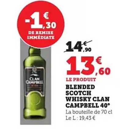 Découvrez le Blended Scotch Whisky Clan Campbell 40° à un prix imbattable. Pour les amateurs de whisky, c'est l'occasion parfaite d'essayer ou de redécouvrir un grand classique. Avec une remise immédiate de 1,30 €, ce whisky de qualité est désormais à seulement 13,60 €. Pourquoi ne pas se faire plaisir ou offrir ce délicieux breuvage à un ami ?