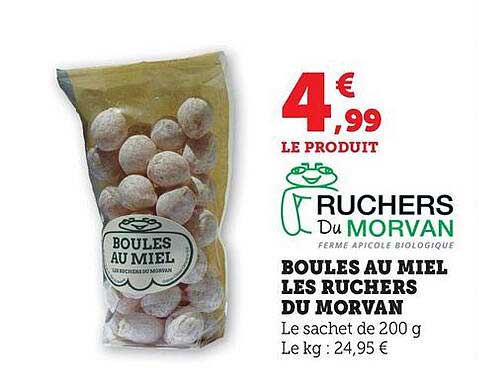 Découvrez une douceur unique avec les Boules au Miel des Ruchers du Morvan, un délicieux produit de la ferme apicole biologique. Parfaites pour les amateurs de miel, ces boules sucrées sont idéales pour accompagner vos moments de détente. Profitez de cette offre exceptionnelle, valable du 2025-10-21 au 2025-10-26.