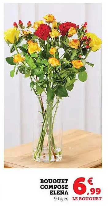 Le bouquet composé Elena, avec ses 9 tiges, est parfait pour tous les moments de la vie. Que ce soit pour ravir un être cher ou pour embellir votre décoration, ce bouquet fait son effet. L'association de roses rouges, jaunes et d'autres fleurs aux teintes éclatantes crée un véritable festival de couleurs qui saura séduire tous les regards.