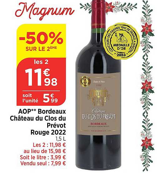 Découvrez dès maintenant la offre Château du Clos du Prévot Rouge 2022 dans le catalogue de Bi1. Cette offre est valable du 26/12/2024 au 31/12/2024.