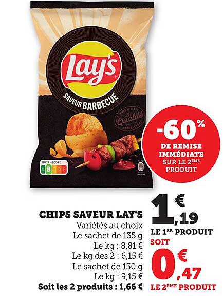 Découvrez l'incroyable promotion sur les Chips Saveur Lay's, une excellente occasion de savourer ces délicieuses chips au goût barbecue. Parfaites pour vos apéritifs ou vos soirées entre amis, ces chips vont séduire vos papilles !
