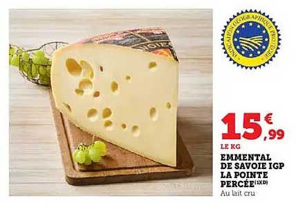 Découvrez l'Emmental de Savoie IGP La Pointe Percée, un fromage savoureux qui ravira vos papilles. Élaboré à partir de lait cru, il offre une texture fondante et une saveur délicate, idéale pour les apéritifs ou les plats cuisinés. Profitez de cette offre exceptionnelle, valable du 27 octobre au 9 novembre 2025, et faites le plein de bonnes affaires sur cette page.
